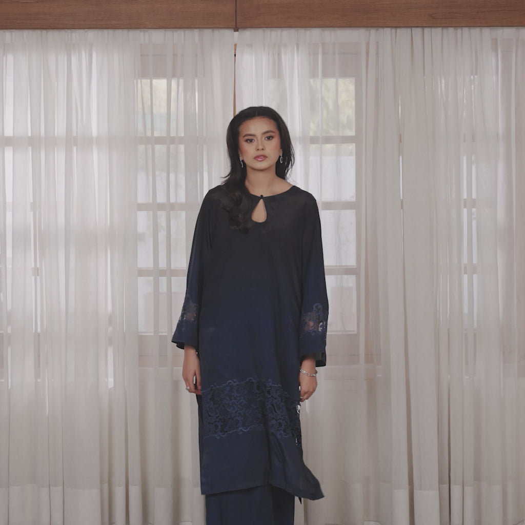 This two-piece raw silk ensemble features a stunning ombré transition from deep blue to black, creating a bold yet elegant look. The mid-length shirt, with a keyhole neckline detail, offers a flattering and modern fit. The straight pants complete the look with simplicity, while the intricate appliqué embroidery on the front and sleeves adds depth and texture. A perfect choice for those who appreciate subtle yet impactful design elements.